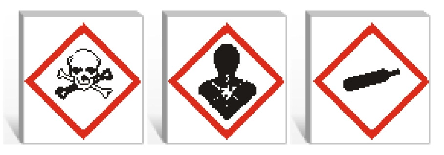 標示內容:高壓鋼瓶,骷髏與兩根骨頭交叉,生殖毒性物質。