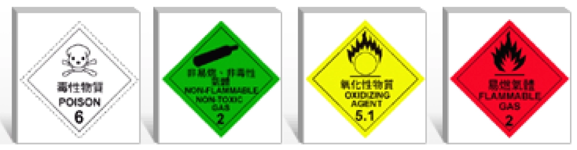 象徵符號:高壓鋼瓶、骷髏與兩根交叉骨、健康危害、圓圈上一團火焰、火焰。